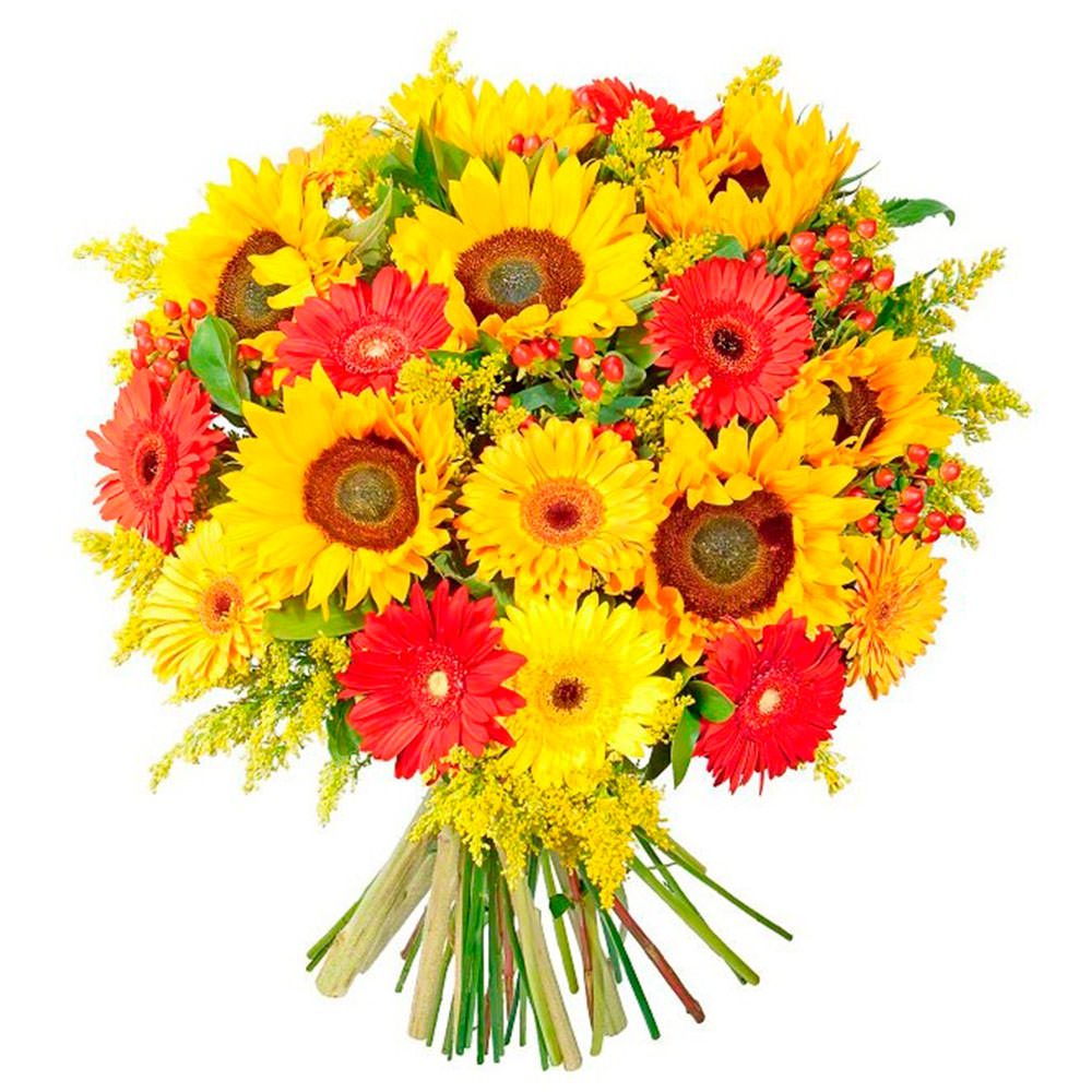 Подсолнух, гербера красная и желтая, астильба, гиперикум. Упаковка (лента, пленка, крафт, сетка, пленка матовая)